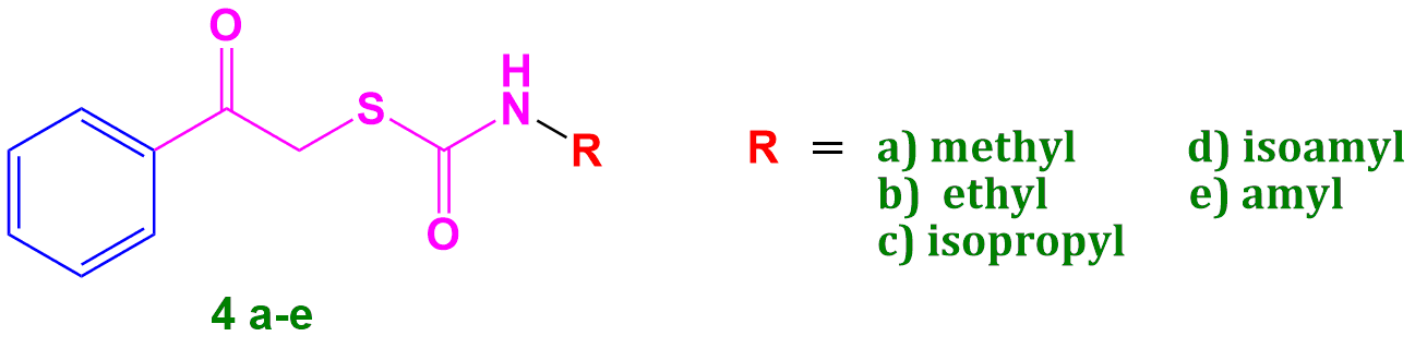 The current study reports the synthesis of S-2-oxo-2-phenylethyl alkylthiocarbamates 4 a-e. Bromination of acetophenone 1 with bromine in the presence of aluminium chloride gave phenacylbromide 2, which on further reaction with ammonium thiocyanate afforded the 1-phenyl-2-thiocyanatoethanone 3; treatment of 3 with appropriate alcohols in the presence sulphuric acid yielded the corresponding thiocarbamates 4 a-e. All the synthesized compounds were characterized by IR and NMR spectroscopic data.